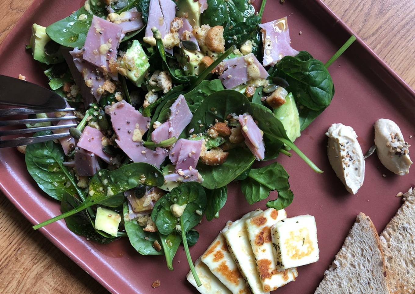 - Dépose tes pouces d’épinards dans l’assiette, ajoute le jambon l’avocat et les croûtons. Parsème tes graines dessus.
