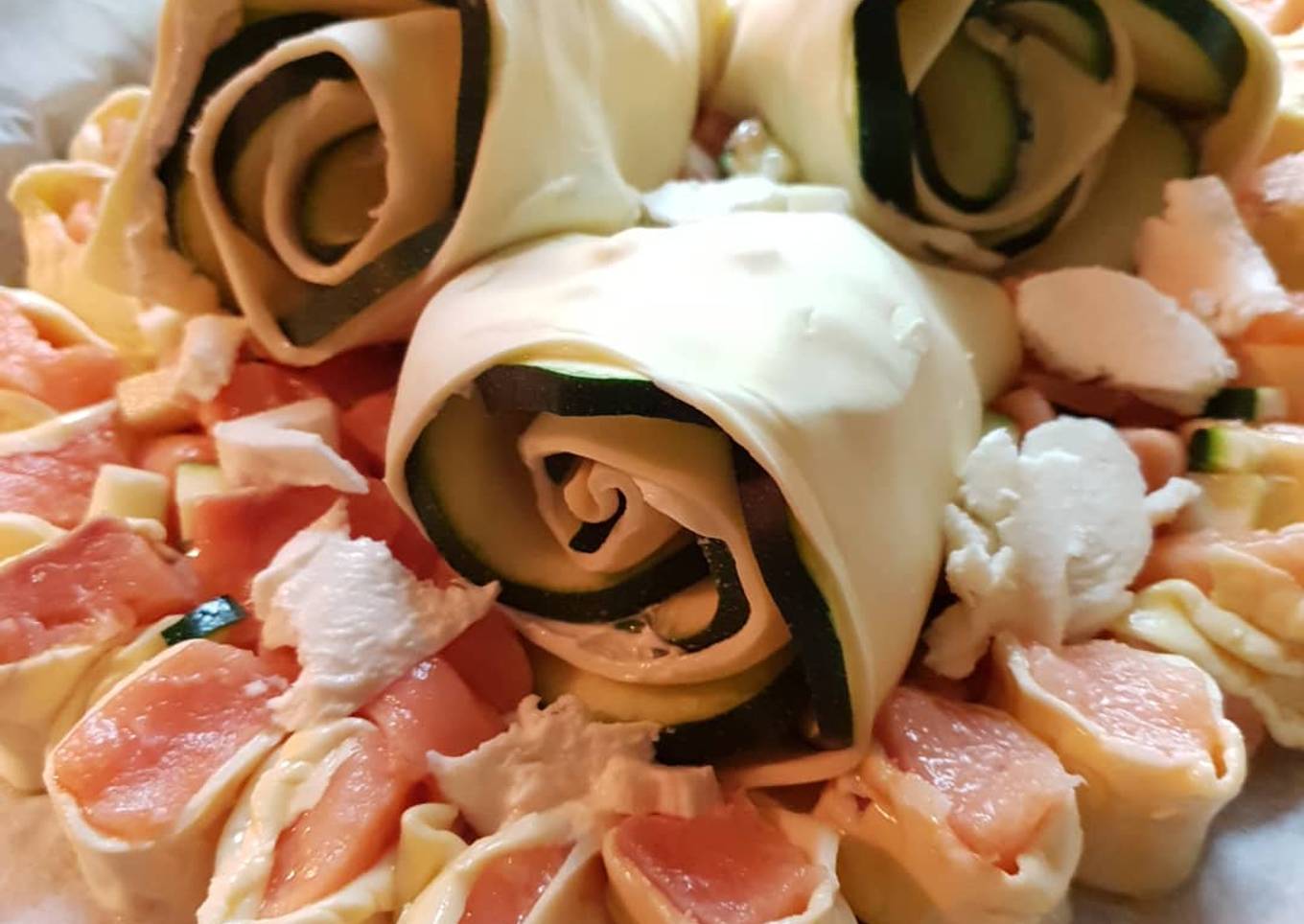- Découpez les morceaux de saumon restant en petits morceaux ainsi que les courgettes (s il vous en reste) et la mozzarella. Déposez les morceaux entre les fleurs.